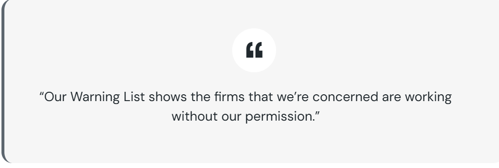 “Our Warning List shows the firms that we’re concerned are working without our permission.”