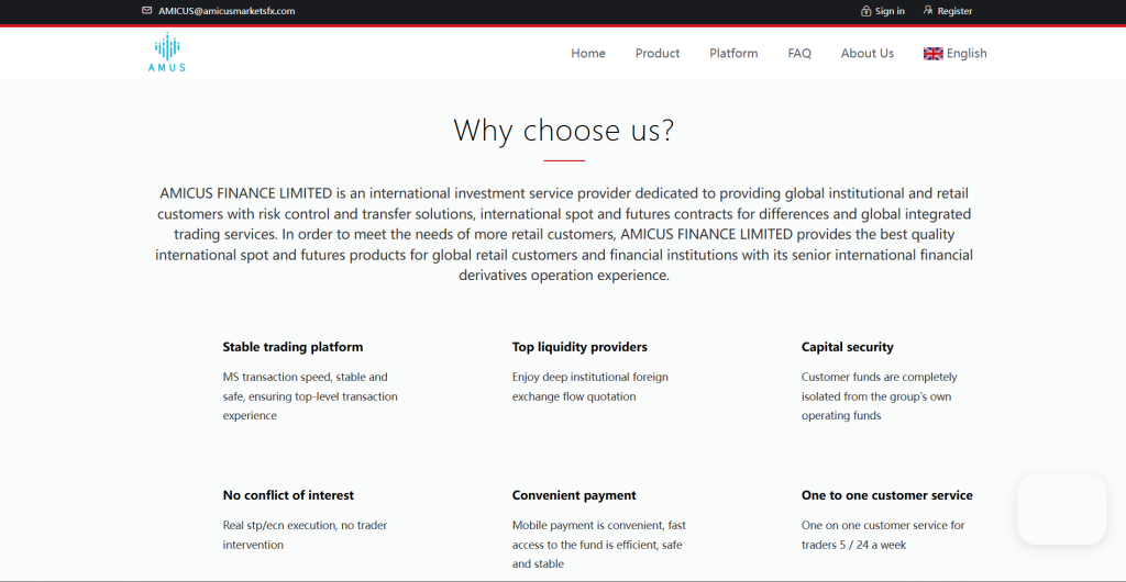 AmicusMarketsFX.com positions itself as an online trading platform that offers access to various financial instruments, including forex, commodities, stocks, and cryptocurrencies. The site claims to provide advanced trading tools, tight spreads, and high leverage options to help traders maximize their returns. It also boasts a sleek interface that appeals to both beginner and experienced traders.