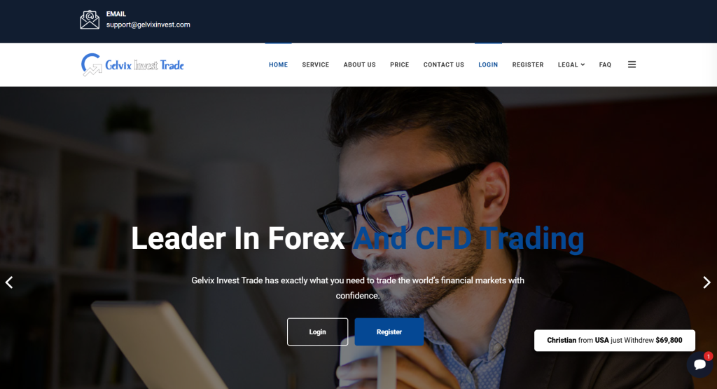 Gelvixinvest.com presents itself as a professional online trading platform claiming to offer lucrative investment opportunities across various financial markets, including forex, cryptocurrencies, commodities, and indices. The website boasts a sleek interface, advanced trading tools, and promises of high returns within short periods. It targets individuals seeking quick profits, often appealing to those unfamiliar with the risks involved in online trading.