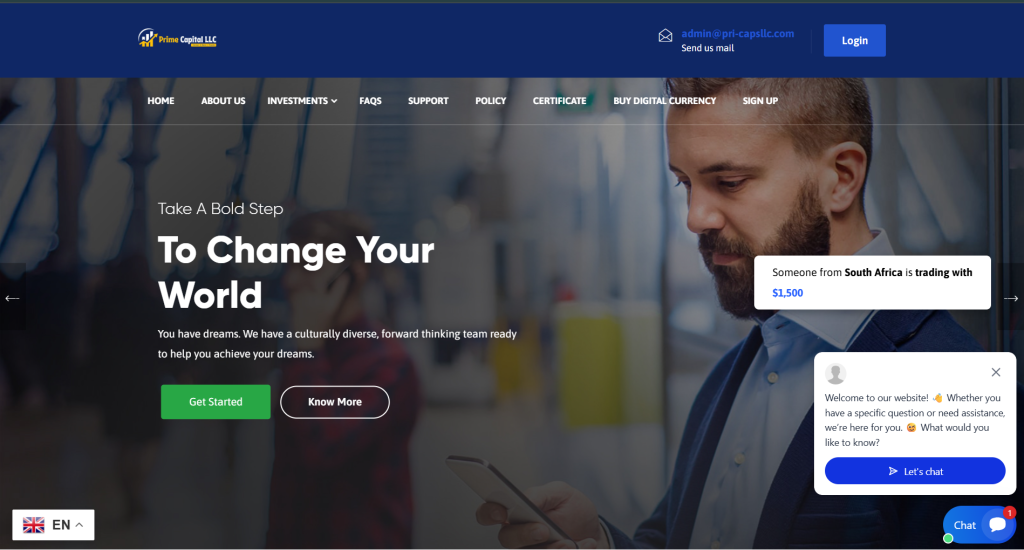 The website pri-capsllc.com presents itself as “Prime Capital LLC” (or Pri-Caps LLC) and claims to offer a full range of investment/asset-management services. Among the claims on the site:
